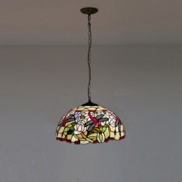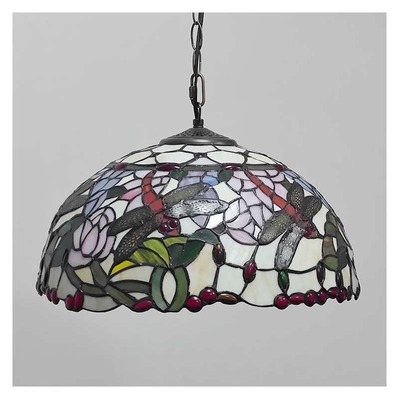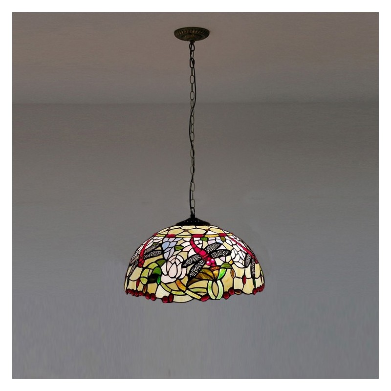 Lampada a sospensione in vetro colorato stile Tiffany da 16 pollici con libellula. Plafoniera vintage in vetro colorato